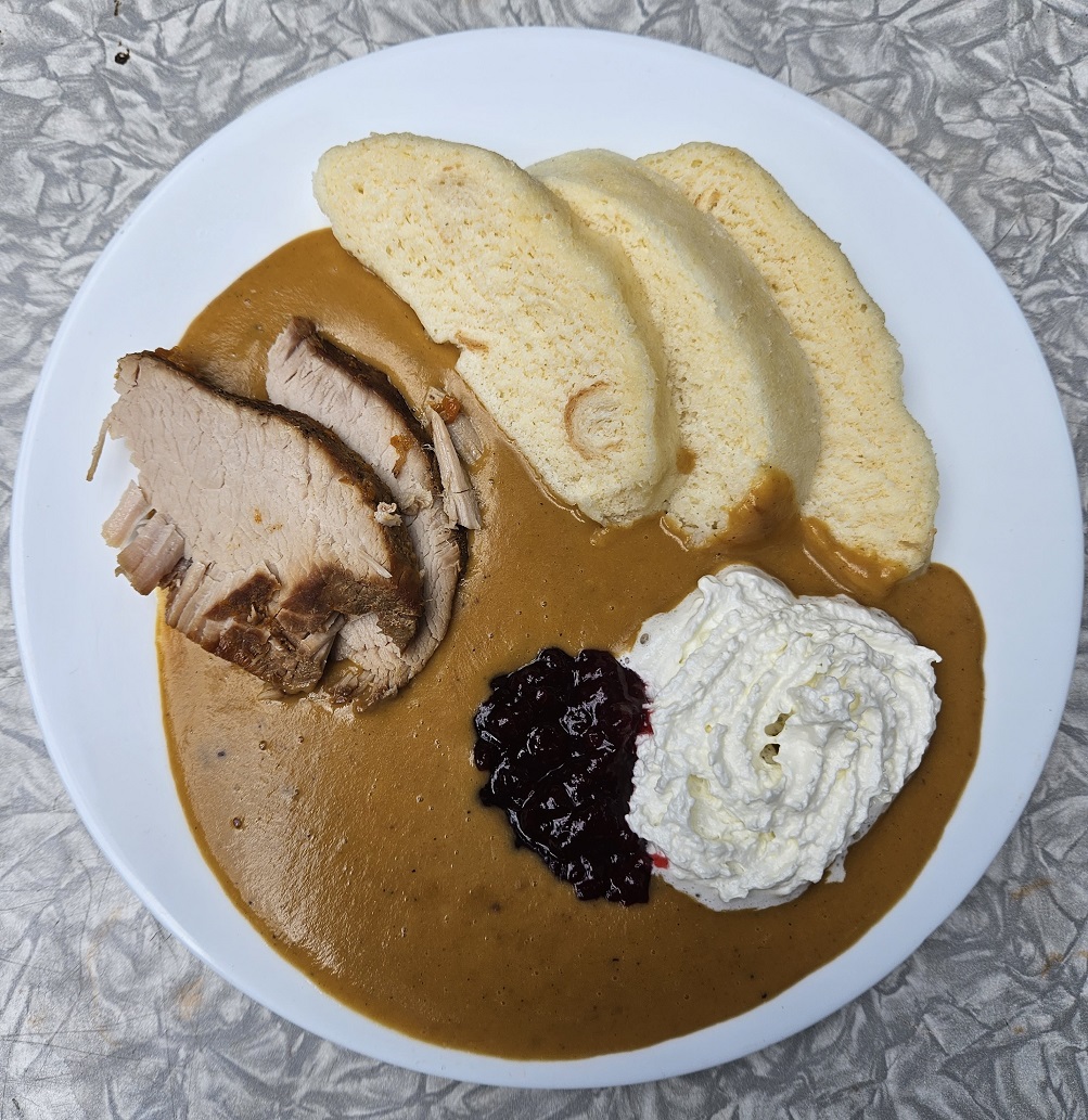 Oběd: kuřecí vývar s játrovými knedlíčky, svíčková, houskový knedlík