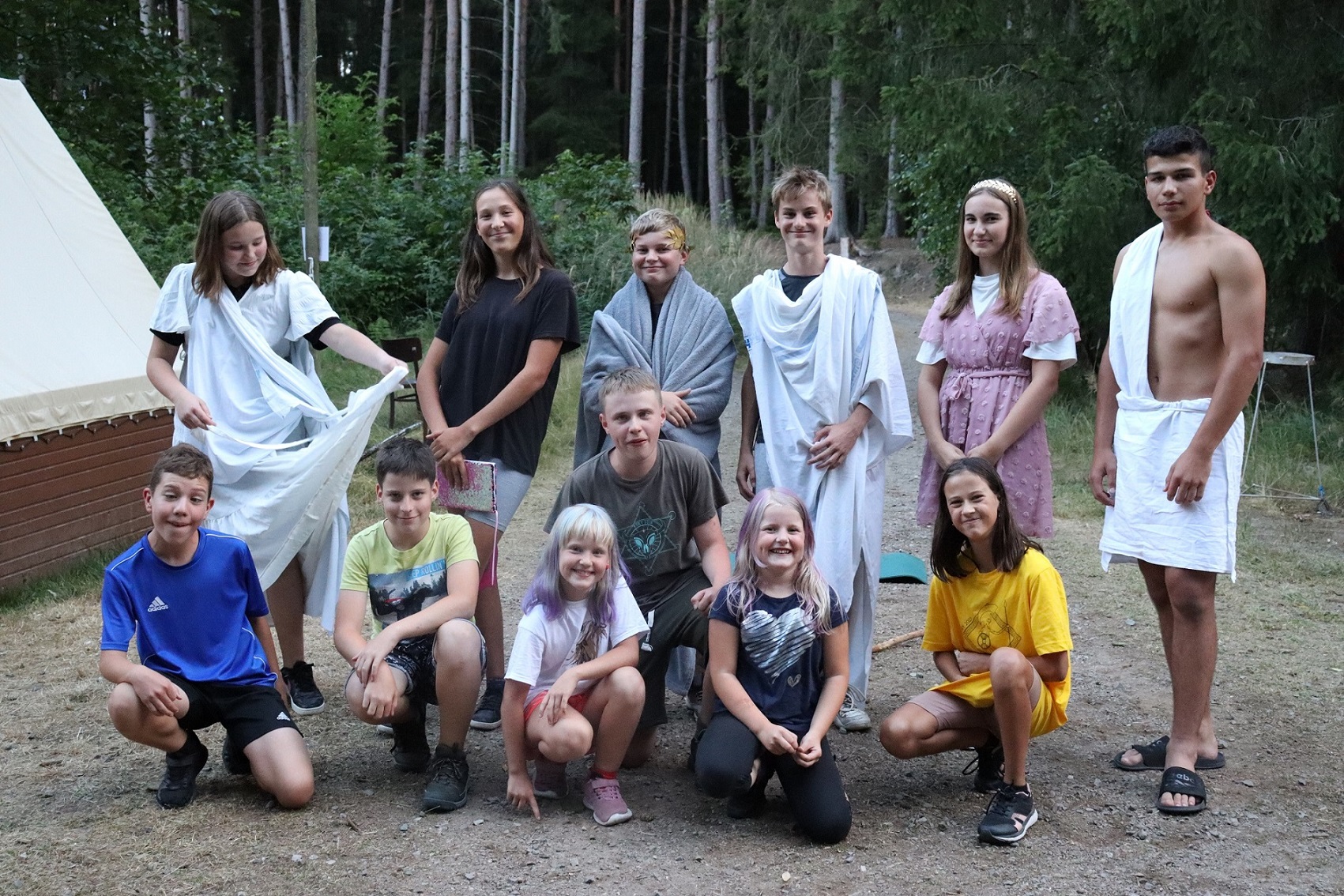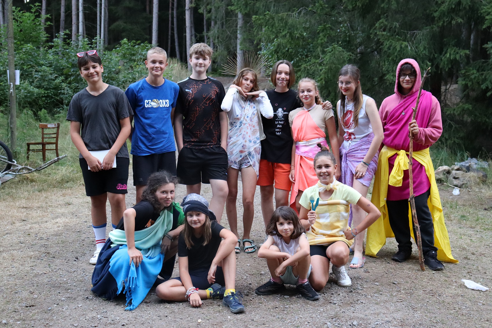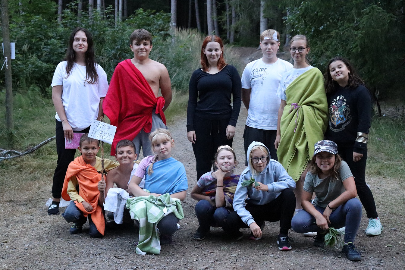 Program: Dnes nás čekal den naruby. Ráno jsme si užívali Srandiádu, kdy jsme plnili zábavné úkoly a za získané penízky jsme mohli získat sladkou odměnu. Odpoledne jsme museli porazit Sirény, proto jsme plnili v oddílech úkoly, kde jsme museli být potichu. Večer jsme ostatním polobohům zahráli v amfiteátru naše secvičená představení. Potom jsme se všichni z nás poschovávali v lese a připravili stezku odvahy pro vedoucí.