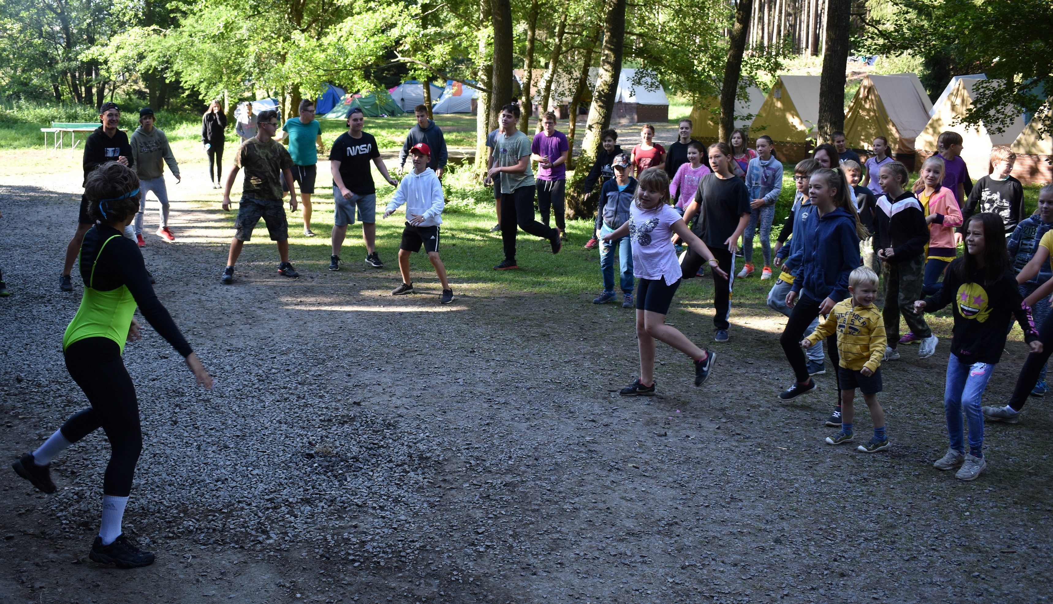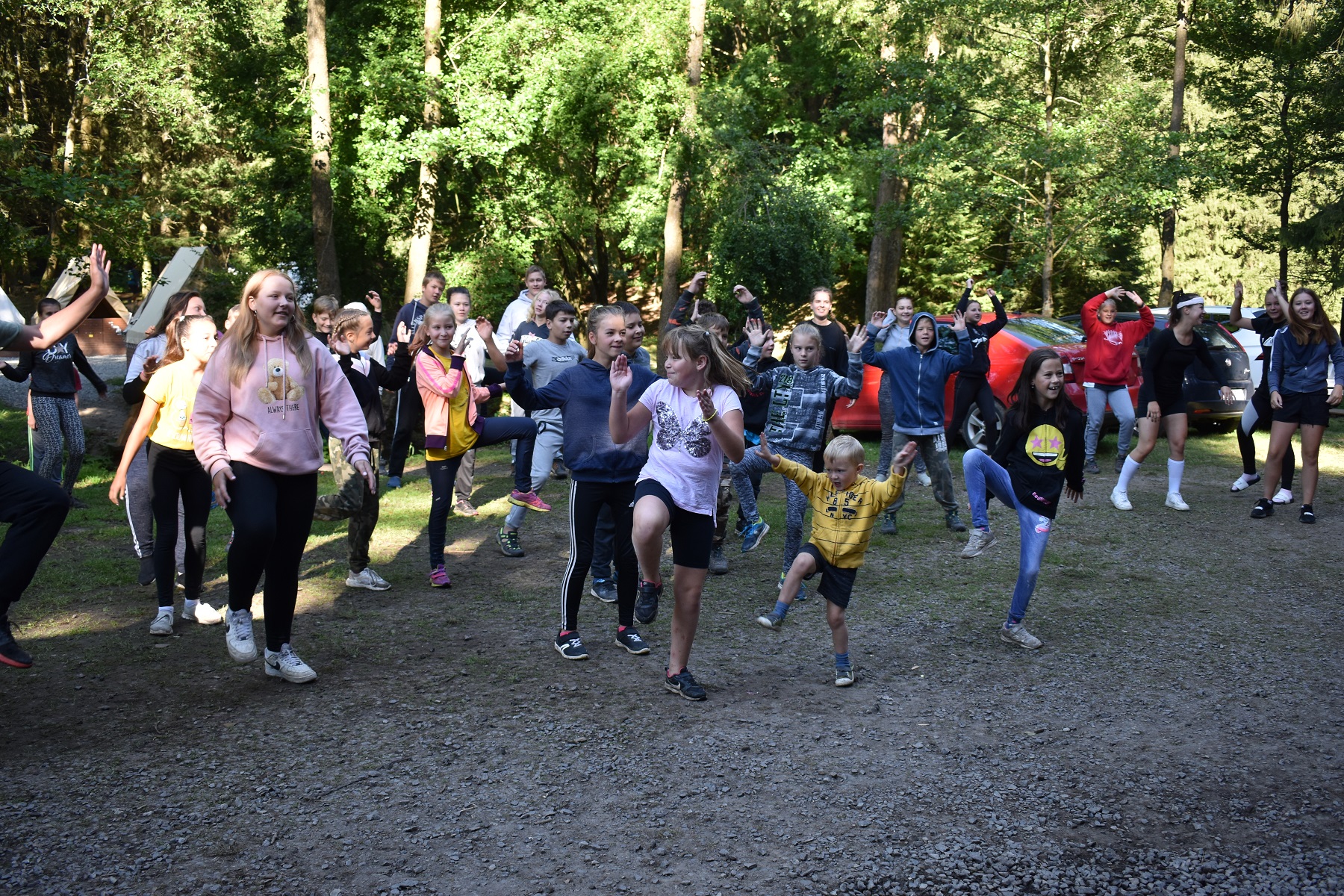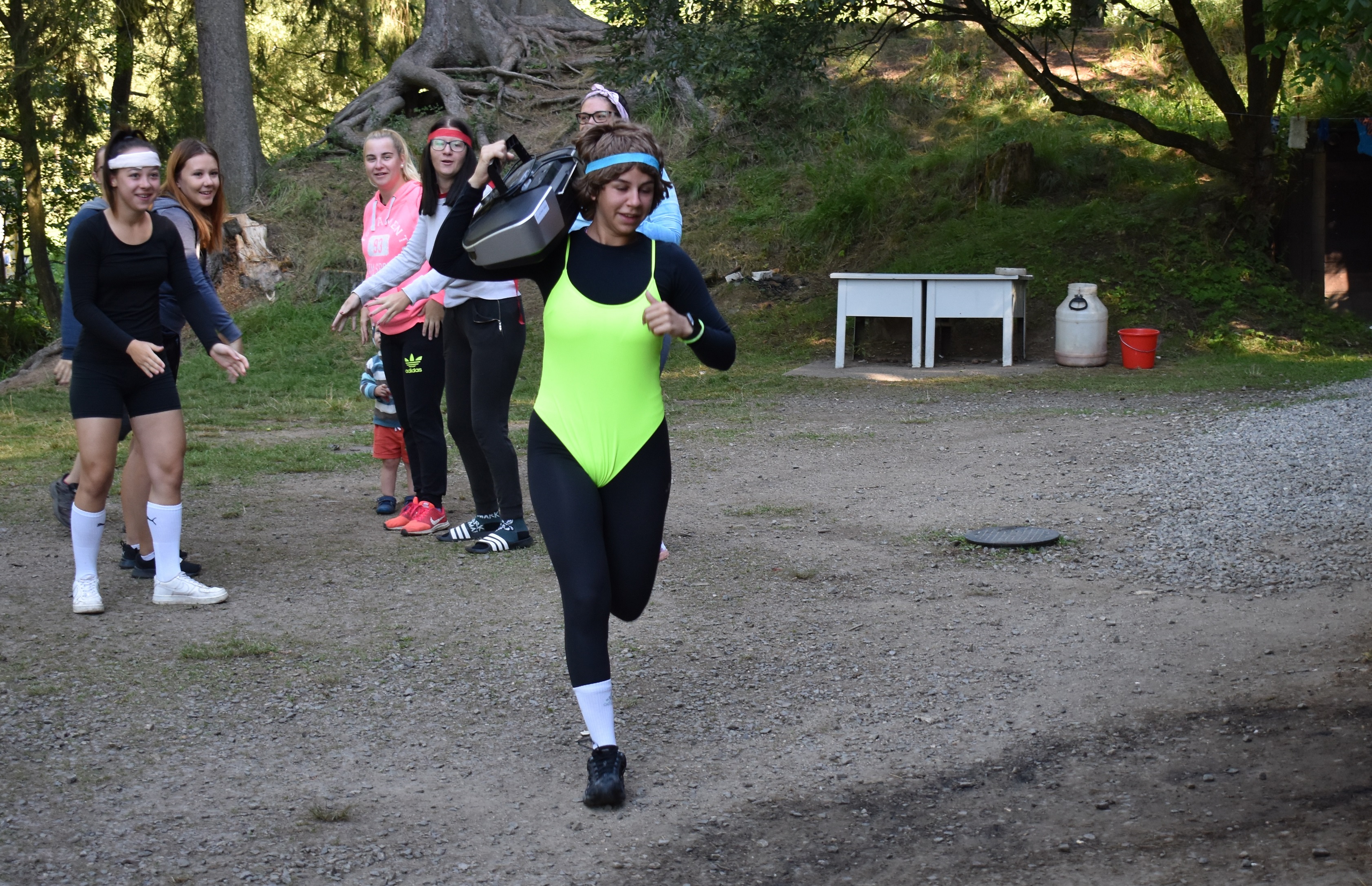 Další naší zastávkou byla Retro planeta. Ráno začalo rozcvičkou ve stylu retro. Cvičitelka aerobiku nás